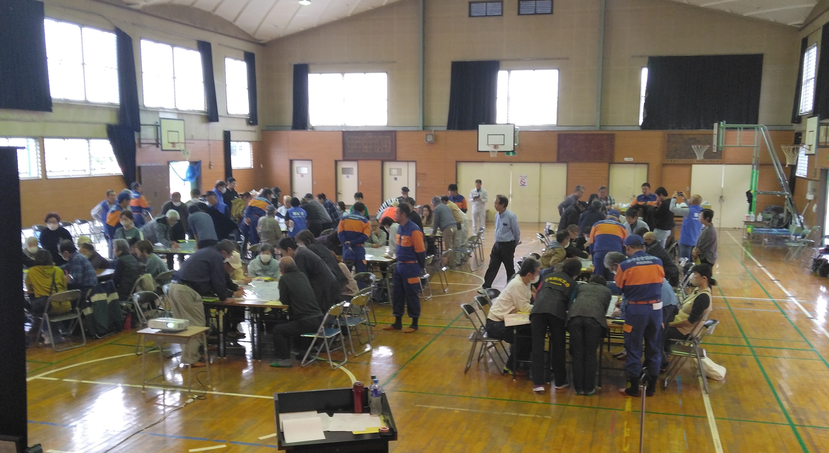 当日は、校区内の方々が約100名程参加され、9班に分かれて訓練に臨みました。校区が広いこともあり、実際に住んでいる地域ごとに地図をわけて班づくりをしました。今回は2時間半の枠ということで、地図のマッピングと災害発生時における行動シミュレーションまでとしました。